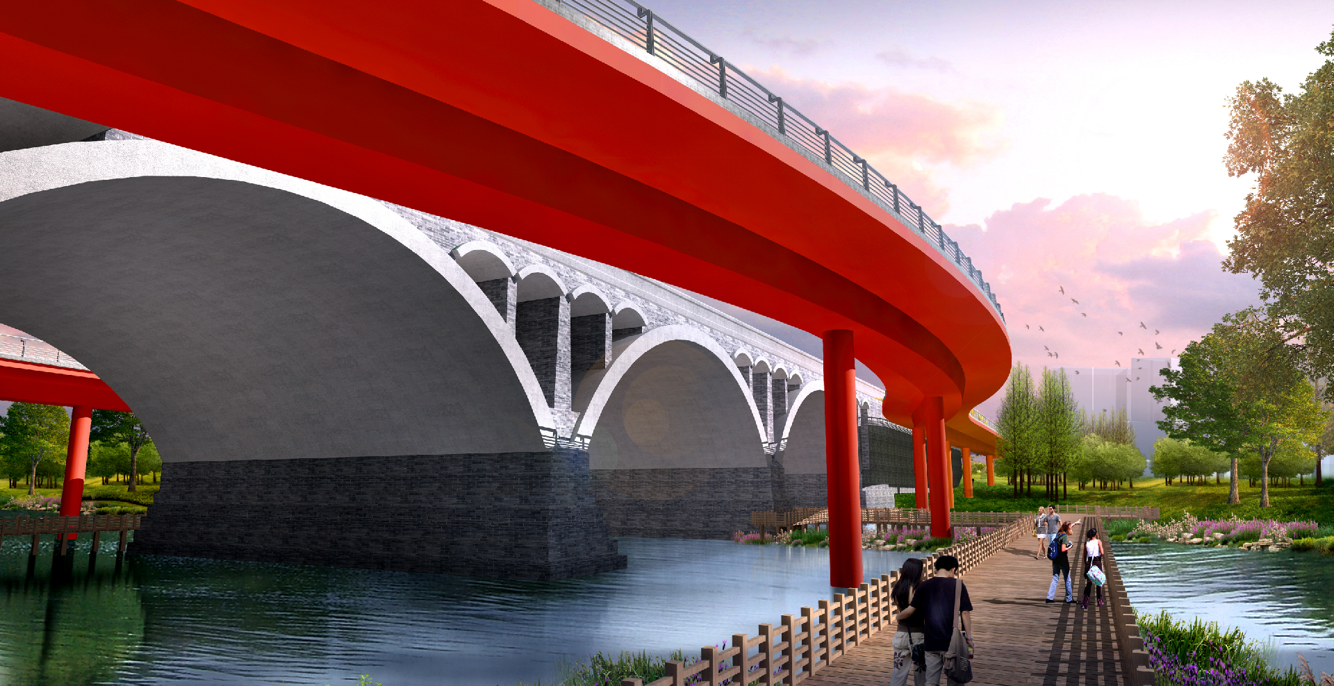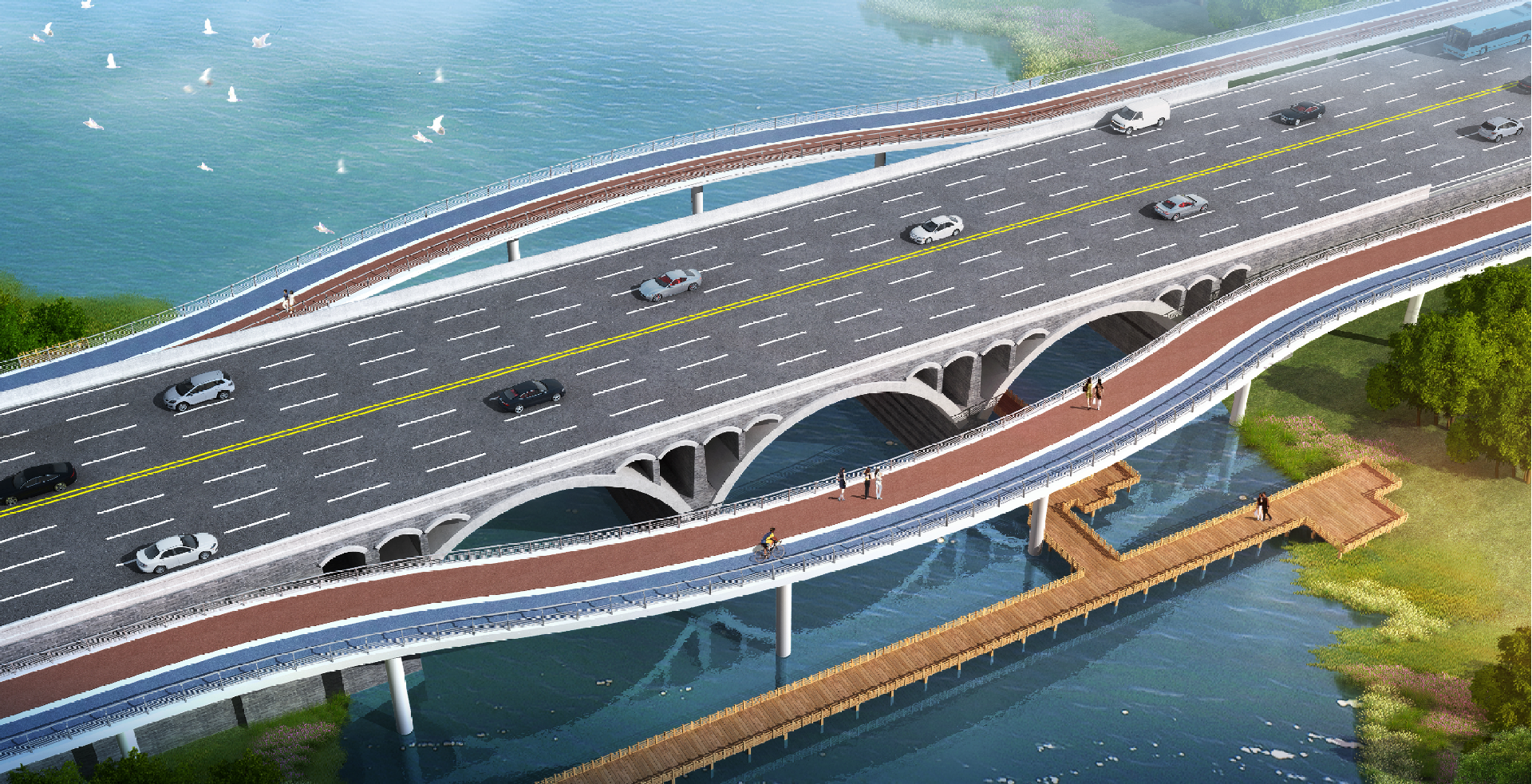 萊蕪區(qū)月波湖橋改造工程,老橋慢行空間改造為機(jī)動車道,實(shí)現(xiàn)雙4改雙8 兩側(cè)新建2座5跨行橋同步確保新老橋孔慢行過街功能,拼橋選取上玄月及飄帶造型,提升橋梁景觀,同時(shí)避讓現(xiàn)狀慢行步道。